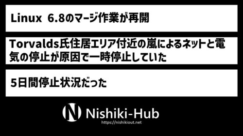 3行まとめ Phoronixによると、Linus Torvalds氏によるLinux 6.8へのマージ作業が再開したことがわかりました。