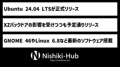 3行まとめ Ubuntuの最新の長期サポート版(LTS)である、「Ubuntu 24.04 LTS」がStableに到達し、ISOなど公開されました。