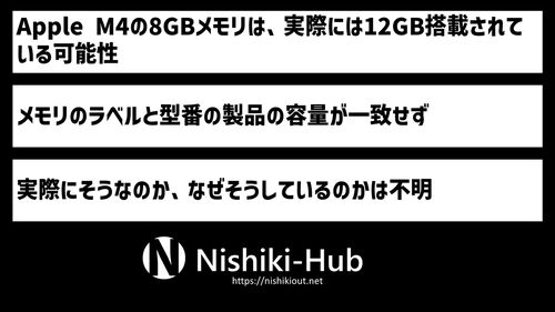 3行まとめ MacRumorsのフォーラムでlayerstack氏が、8GBメモリを搭載したApple M4は、実際には12GBのメモリを搭載している可能性を指摘しています。