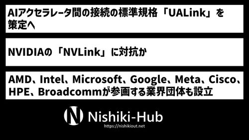 3行まとめ IntelやAMD、Google、Microsoftなどは、AIアクセラレータ間での高速かつて一円での通信を実現するコネクト規格「Ultra Accelerator Link」(UALink)を策定することと、業界団体として「UALink Promoter Group」を設立することを発表しました。こ…