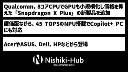 3行まとめ Qualcommは、PC向けのSoCラインナップ「Snapdragon X」に新たに廉価帯グレード「Snapdragon X Plus」シリーズを追加しました。