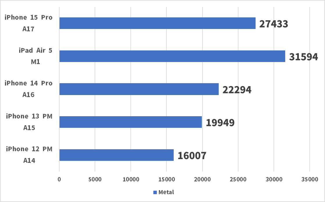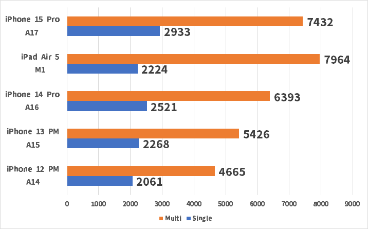前世代のA16と比較すると23%性能が向上しています。また、M1ともかなり接戦となっています。