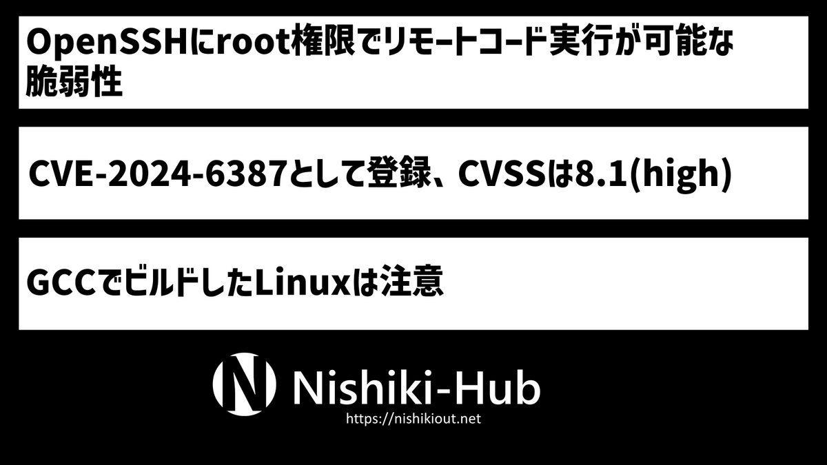 この脆弱性は、glibcベースのLinuxシステムにおいて、認証していないリモートからroot権限で任意のコードが実行されるというものです。CVE-2024-6387として登録されておりCVSSは8.1(High)とされています。