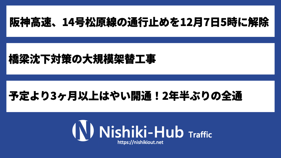 阪神高速道路は、橋梁の架替工事のために長期通行止めとなっている14号松原線の一部区間について、2024年12月7日 午前5時に解除することを発表しました。